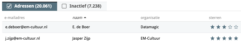 De sterren lopen van 1 t/m 5. Een adres met 1 ster is een inactief adres en een adres met 5 sterren is een adres dat mailingen altijd opent en doorklikt. Het aantal geopende mails en kliks wordt na iedere mailing herberekend en bepaalt de ‘punten’ van een adres. De punten worden vertaald in sterren. De sterren vind je terug in de lijst met adressen en bij het adres zelf.