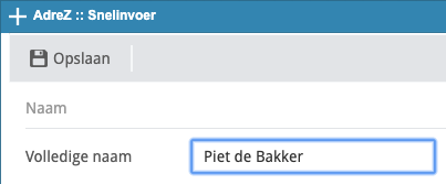 Via de blauwe PLUS knop kan je een nieuw contactpersoon of een nieuwe organisatie toevoegen aan het adressenbestand. Als je zowel een contactpersoon als een organisatie invoert worden ze direct bij elkaar gevoegd. Je begint altijd met het invoeren van de volledige naam van het contactpersoon: